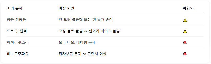 실외기 소음은 소리의 종류만으로도 원인을 유추할 수 있습니다. 아래 유형에 해당하는 소리가 난다면 바로 조치가 필요해요!