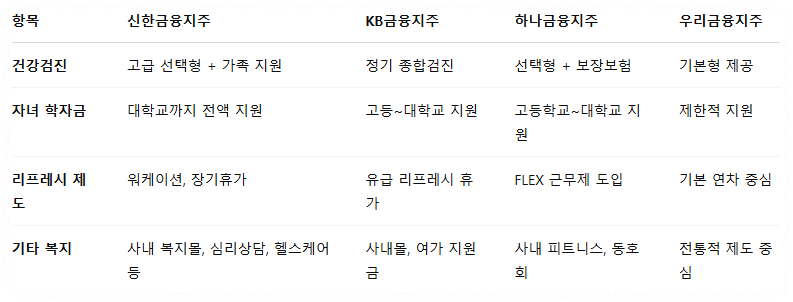KB는 가장 전통적이고 안정된 복지, 우리금융은 상대적으로 보수적인 편입니다.