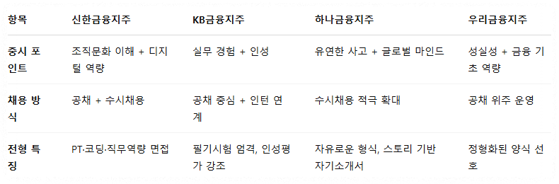 신한 & 하나는 지원자에게 **‘확장된 스펙트럼’**을 요구하는 경향이 강합니다.