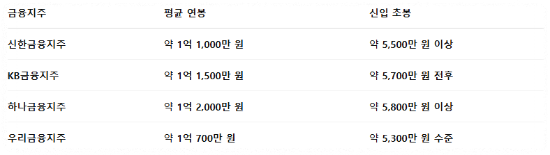 2024년 공시자료 기준, 4대 금융지주 평균 연봉은 다음과 같습니다.