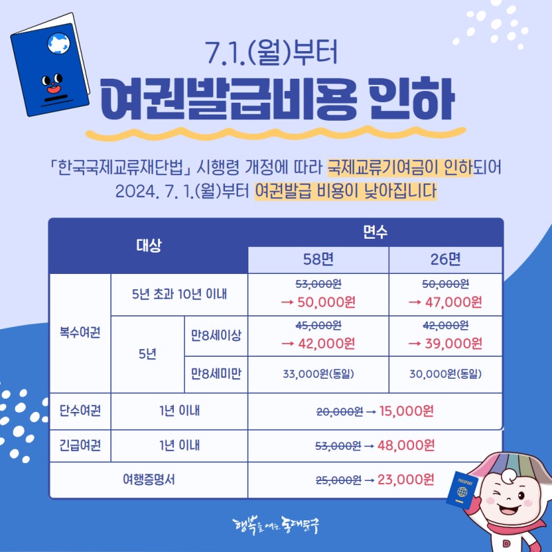 - 일반여권 (5년 유효기간): 발급 수수료는 42,000원입니다.