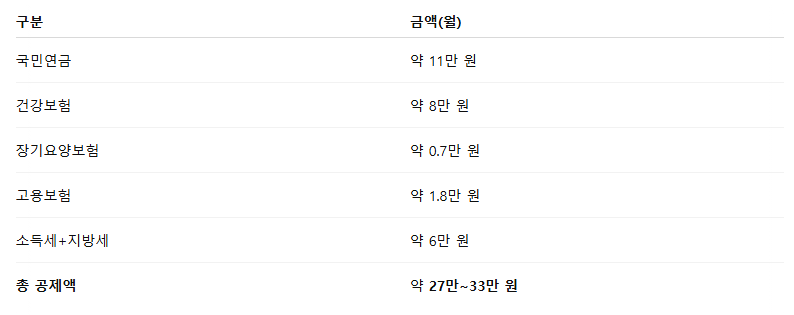 - 4대 보험 공제: 약 33만 원 (건보+국민연금+고용보험+장기요양보험)