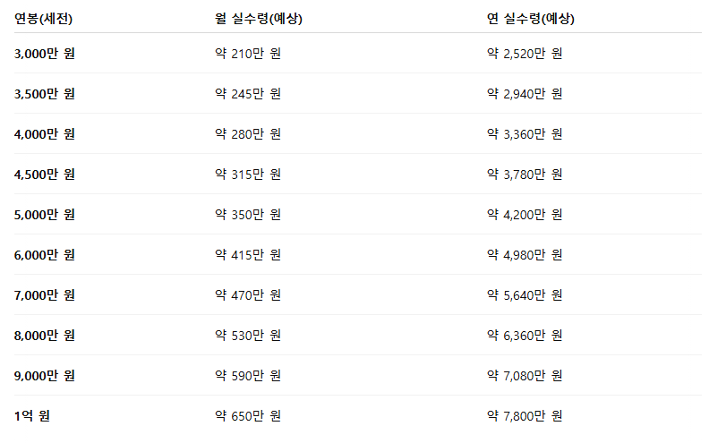 - 연봉 3천 → 월 실수령 210만 원 수준