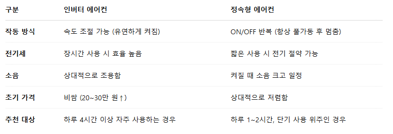 💡 핵심은 👉 "자주 틀 거면 인버터, 잠깐 쓸 거면 정속형"!
